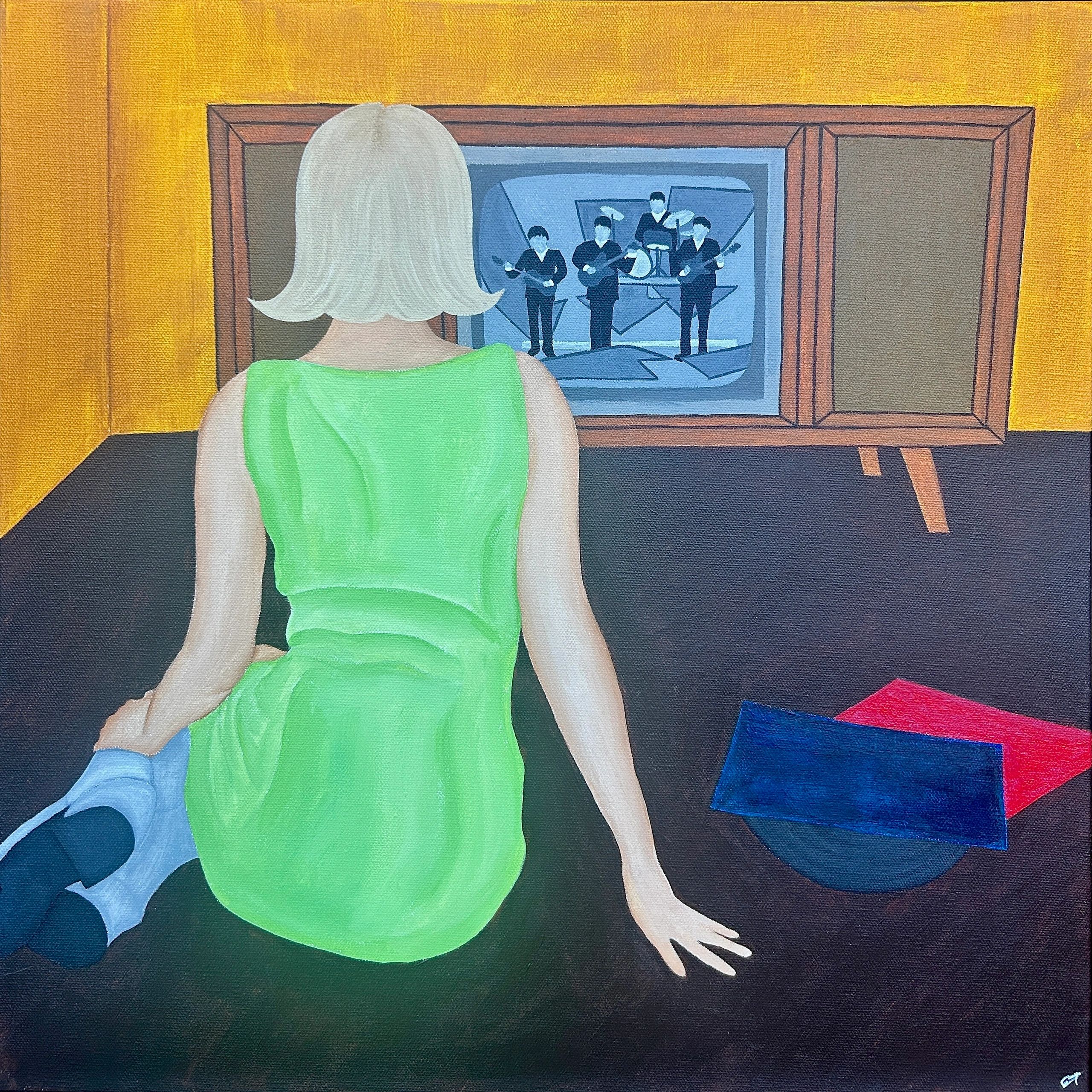 I was inspired by the Beatles first appearance on the The Ed Sullivan Show. Since this was their first US television performance, it is a significant moment in their career as well as in pop culture as whole. I wanted to depict a young girl in the 60s watching the performance, as well as foreshadow their Blue and Red complication albums that came out after the band had broken up. I wanted to transport the viewer back in time as well as show them the cultural significance the band had and still has on music today.