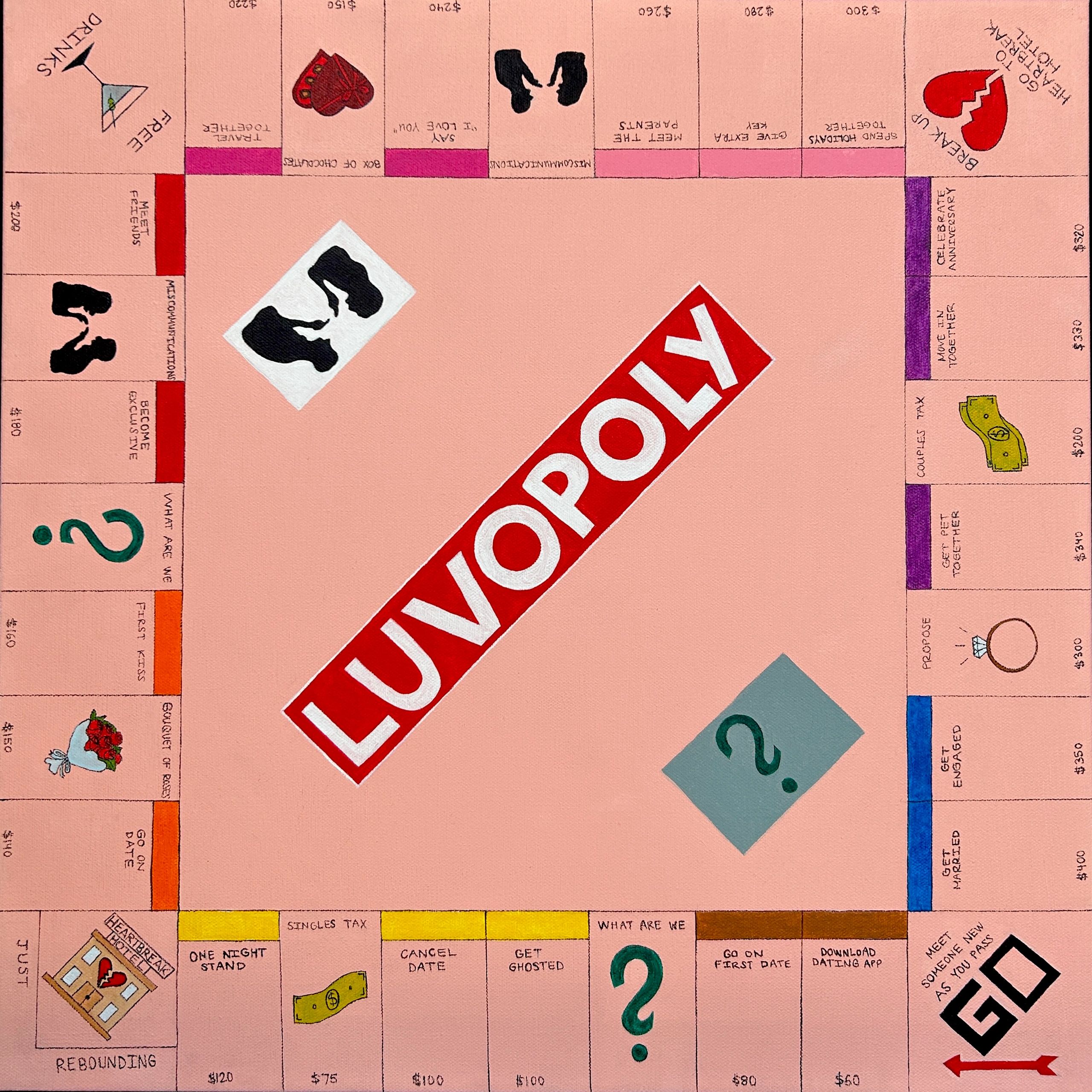 This piece is heavily inspired by the most well known board game, Monopoly. I grew up playing the game and loved it, just like any child growing up in the 2000s. Monopoly has hundreds, maybe even thousands of different iterations of the base game. LUVOPOLY is my version: the game of love.